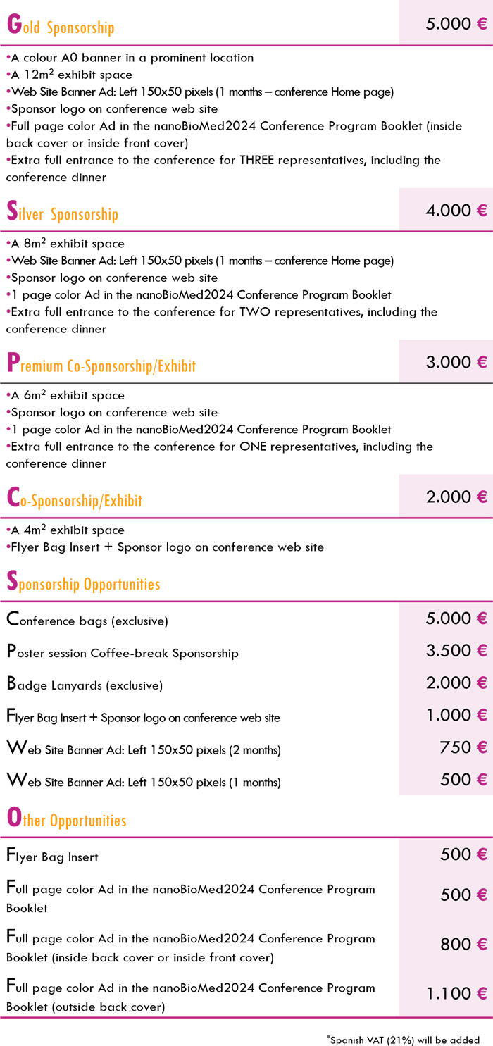 Invoices will be sent on behalf of a legal person (University or Company) or natural person with the added 21% Spanish VAT