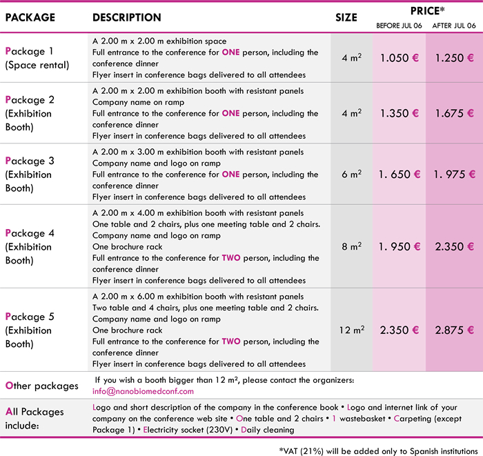 Payment must be made in Euros by credit card or bank transfer through the registration system (all bank charges and commissions must be paid by the participants). Please note that your invoice will be issued in Euros. A confirmation e-mail will be sent to you after a successful registration. If you encounter any troubles, please contact the conference organizers atΒ info@nanobiomedconf.com.